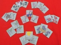 36枚のカードには、桜、梅、菊、菖蒲、松など、日本の草花が、僅かな濁りが含まれた「和色」で描かれていて、その内の12枚には、鹿や盃、鳳凰などの植物以外の絵と数字、睦月、如月などの「月」の名前が入っています。