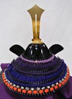 兜の縅糸には正絹糸を用いて、紫と紺の段縅しをお洒落に表現。隠れた所に製作者のオリジナリティがあふれています。