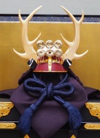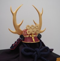 兜の左右に天を突くように据えられた鹿角型の脇立は、「頭角を現す」という意味から、当時の武将が好んで用いていました。全体を赤色で統一した「赤備(あかぞなえ)」の鎧兜で有名な幸村公のにあやかって、兜鉢と小札も赤塗で制作し、六文銭の前立を付けました。縅糸は赤とのコントラストが美しい紺糸仕立てです。