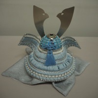 正絹縅糸が美しい兜は、兜鉢を空色、小札板をシルバーで仕立てました。女性好みの優しい色使いと、男性的な大鍬形がバランス良くお飾り全体を華やかに彩ります。