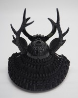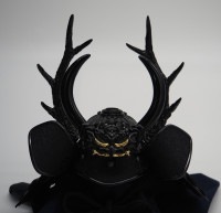 鹿角脇立と獅子噛前立が特徴の本多忠勝公の漆黒兜を、黒艶消しの屏風、飾台にセットしたコンパクト収納飾りです。